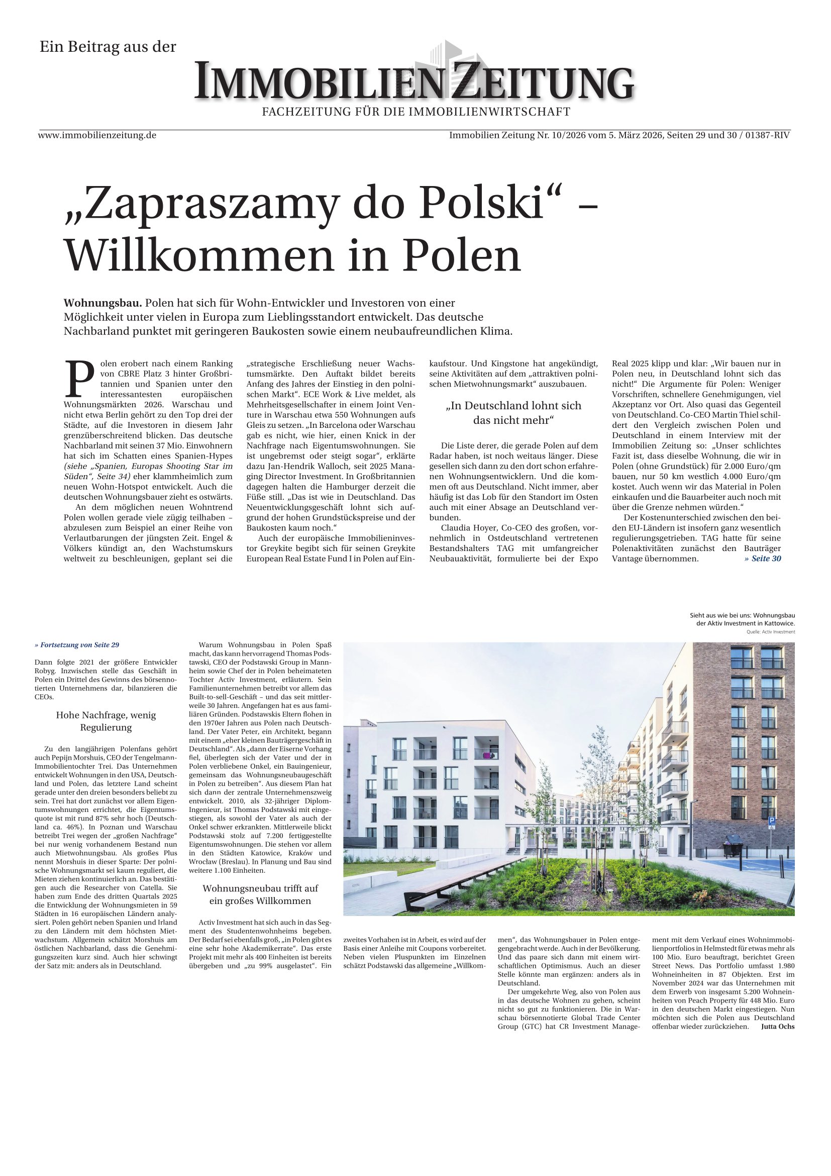 In the article “Willkommen in Polen”, published in Immobilien Zeitung, Thomas Podstawski explains why Poland is increasingly at the center of attention for European residential investors. He points to key advantages that are highly relevant today: lower construction costs, more efficient administrative procedures, shorter permitting timelines, and a more supportive investment environment.